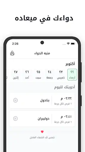 3. ضبط منبه الدواء: أضف اسم الدواء، الجرعة، والمواعيد، وسيقوم التطبيق بإرسال تنبيهات لهاتفك لضمان الالتزام بالعلاج وتجنب مخاطر نسيان الجرعات.