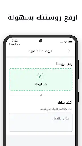 1. طلب الدواء بالروشتة: قم بفتح التطبيق واضغط على “رفع الروشتة”، التقط صورة واضحة لروشتة الطبيب أو علبة الدواء، وسيقوم التطبيق بالبحث عنها في أقرب الصيدليات وتوصيلها لك.