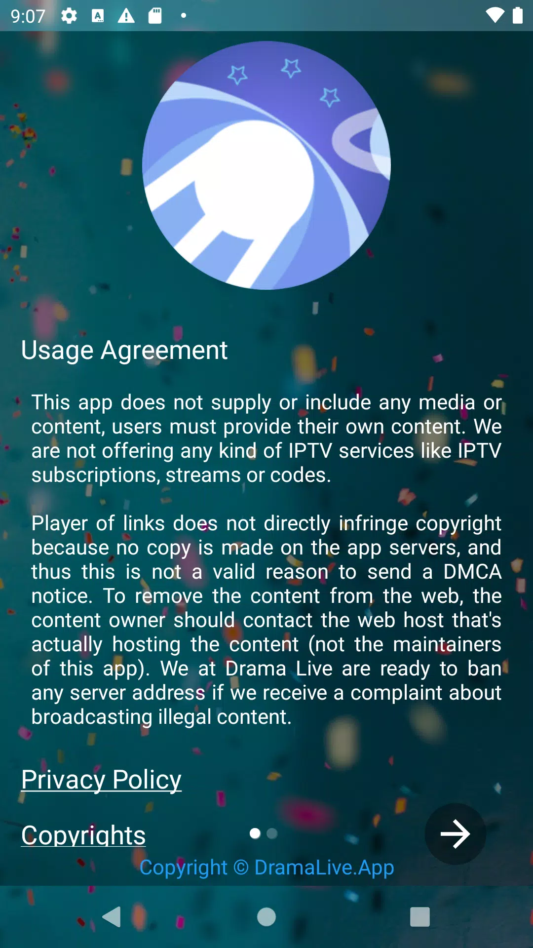 تطبيق Drama Live لا يقدم أو يستضيف أي قنوات أو محتوى. المستخدم هو المسؤول عن إضافة مصادر IPTV الخاصة به من مزودي الخدمة الذين يختارهم. التطبيق غير مرتبط بأي مزود محتوى.